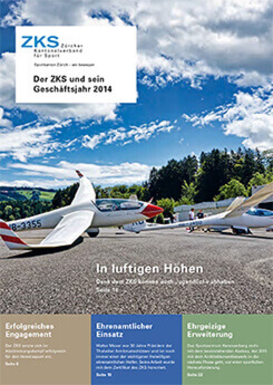 Der Geschäftsbericht 2014 widmet sich dem wirkungsvollen sportpolitischen Engagement des ZKS, dem Ehrenamt als wichtigstes Amt im Sport und der ehrgeizigen Erweiterung des Sportzentrums Kerenzerberg. Weitere Themenbereiche sind der gesellschaftliche Mehrwert des Vereinssports und die enge Zusammenarbeit des ZKS mit seinen Mitgliederverbänden anhand eines Beispiels. Der Geschäftsbericht zeigt auf, wie auch Jugendliche dank dem ZKS in luftige Höhen abheben können.